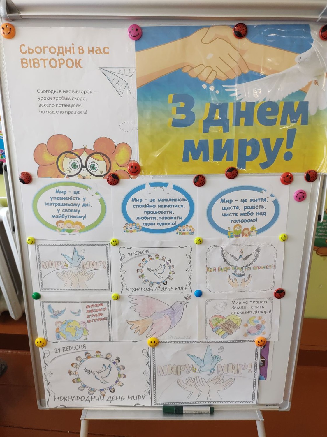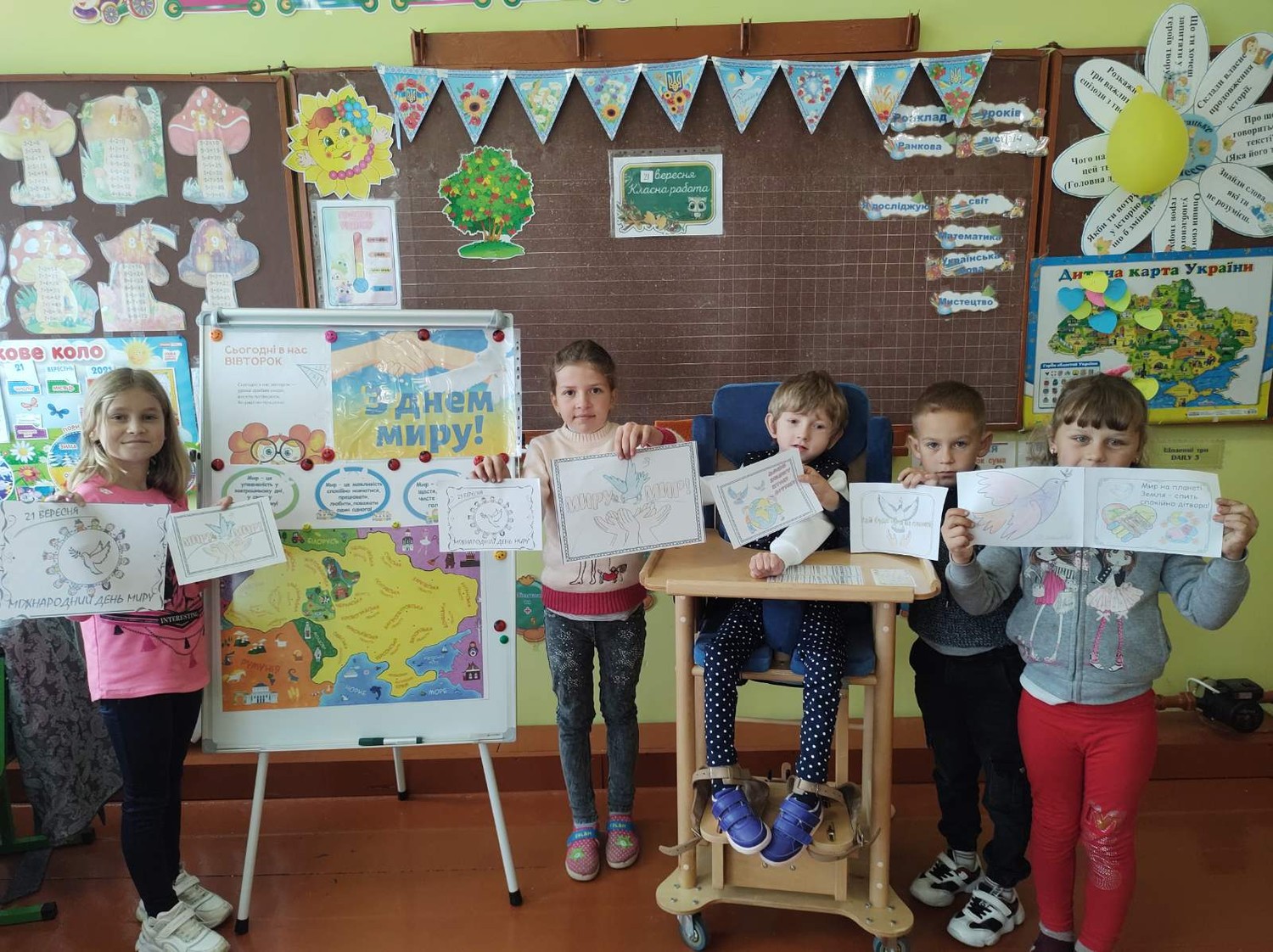 Найбільше у світі щастя - це мир, коли люди живуть дружно і спокійно, земля не здригається від страшних вибухів, не ллються сльози горя і втрат. 21 вересня, у Міжнародний день миру , здобувачі освіти 3 класу підготували виставку малюнків ,, Хай буде мир на планеті Земля!''.